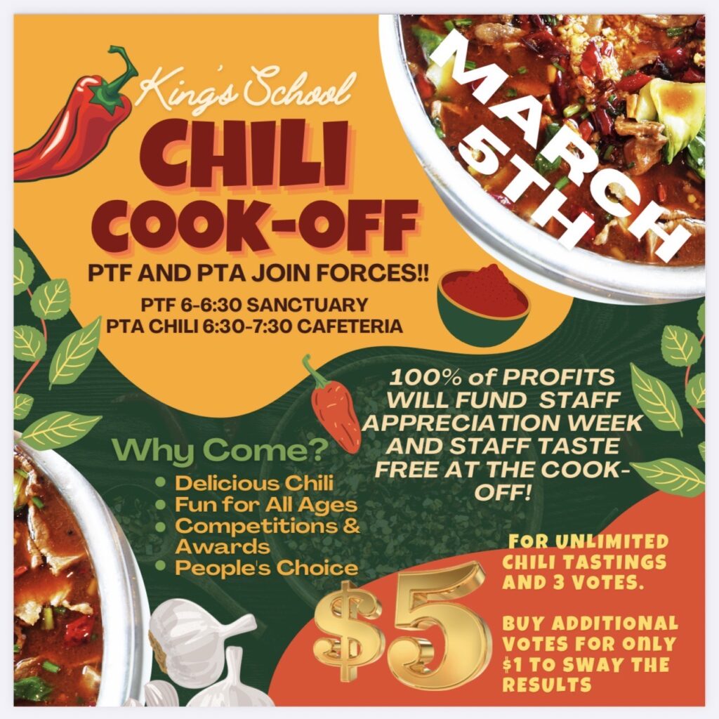 Think you make the BEST chili? Put it to the test! Come join the PTA for a fun evening of friendly competition! This event will directly follow the school’s Parent Teacher Fellowship – make sure you drop in there first at 6:00.